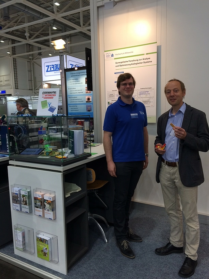 Vom 16.-18. Mai 2017 findet in Hannover die Biotechnica/Labvolution Messe in Hannover statt. Hier präsentieren René Kretschmer und Röbbe Wünschiers wieder die Fachgruppe Biotechnologie und Chemie mit ihren Forschungsprojekten und Studiengängen auf dem Gemeinschaftsstand Mitteldeutschlands "Forschung für die Zukunft". Das Band zwischen Hannover und Mittweida geht weit über die Messe hinaus. Von 1920-22 studierte der später Keksfabrikant Hans Bahlsen in Mittweida Maschinenbau. Das erworbene Wissen brachte er später im Bereich Verpackungstechnologie in das Hannoveraner Unternehmen ein. Ein präsentiertes Forschungsprojekt von Professor Wünschiers behandelt die biologische Erzeugung von Wasserstoffgas. Der zweitgrößte Wasserstoffverbraucher ist die Lebensmittelindustrie; insbesondere zur Raffinierung pflanzlicher Fette – z.B. für Kekse. Warten wir ab, was die Zukunft bringt.